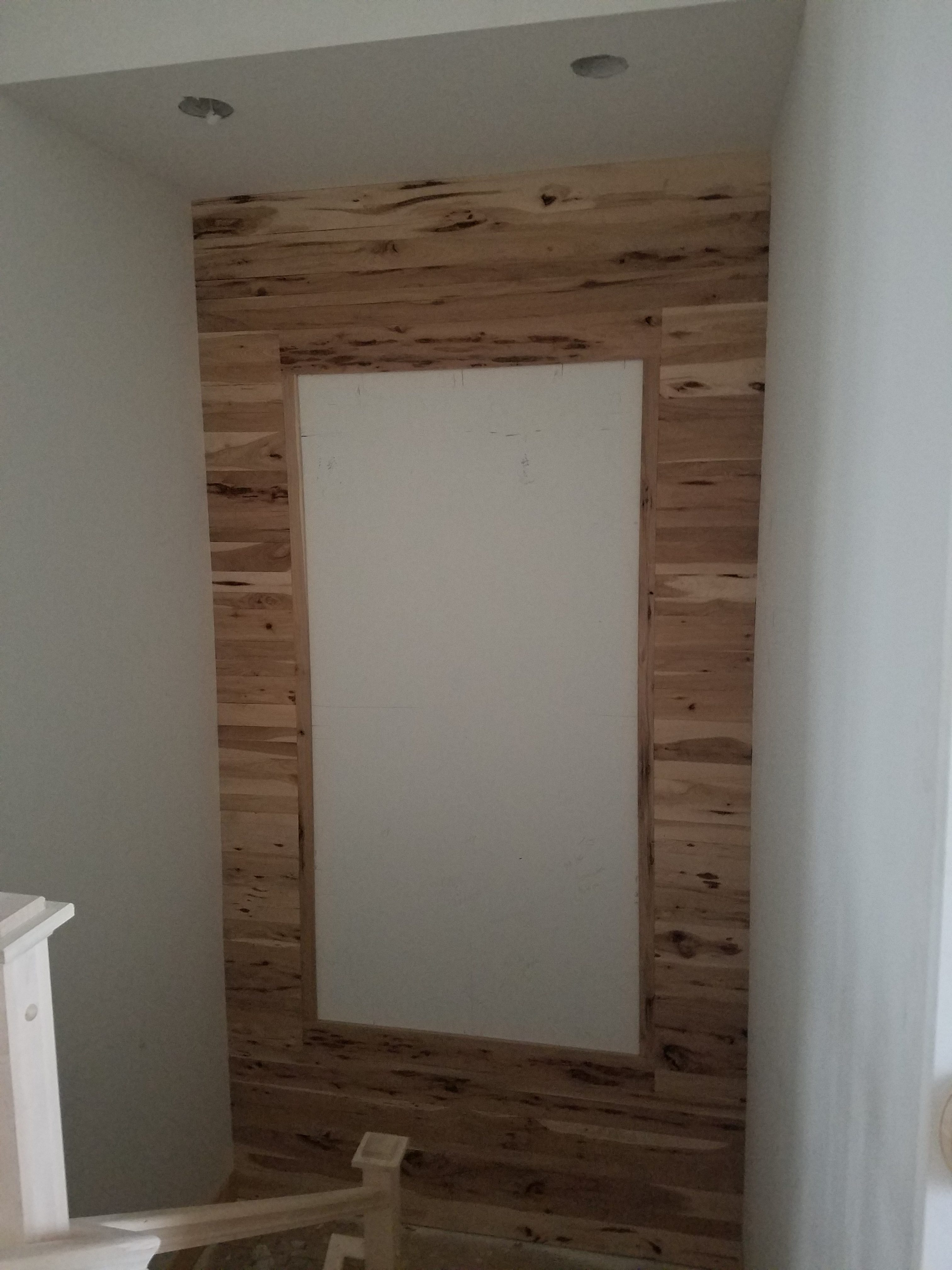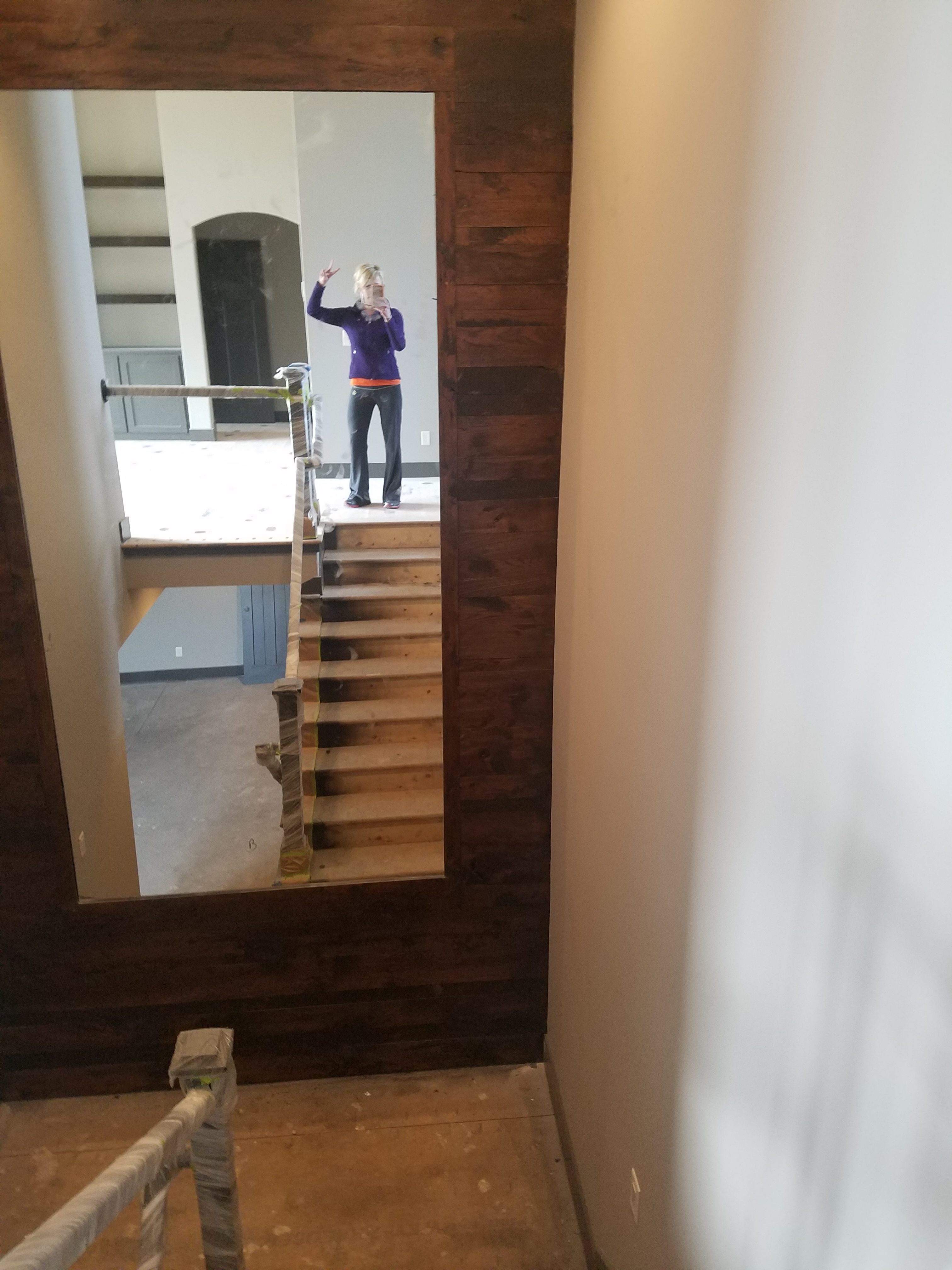 These clients wanted some “rustic WOW” added to their dream home. They found reclaimed wood and we made it a focal point on the large wall above the stair case landing…the mirror makes it the perfect POP of Dream Home Detail! Here’s the before and after~